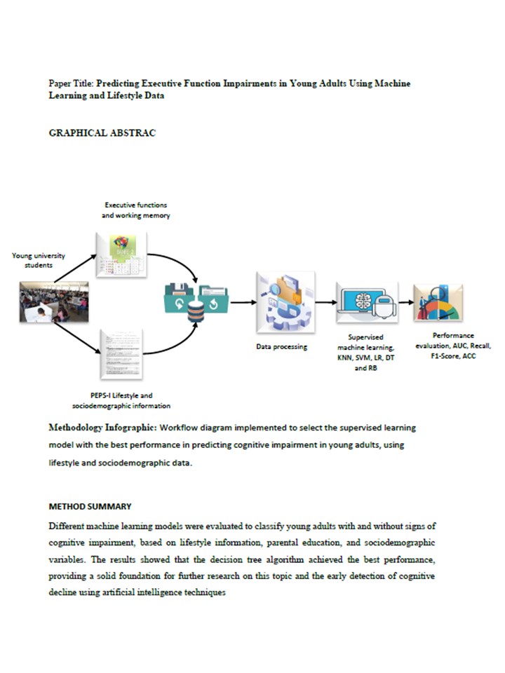 The development of executive function (EF) impairments in young individuals, such as difficulties with attention, memory, and problem-solving, is influenced by biological, social, and lifestyle factors. However, research on predicting these impairments remains limited due to a lack of reliable tools. This study analyzed 90 university students using EF tests, lifestyle, and sociodemographic questionnaires. Five machine learning models were evaluated: Decision Trees (DT), k-Nearest Neighbors (KNN), Support Vector Machines (SVM), Logistic Regression (LR), and Random Forest (RF), with cross-validation applied for model assessment. The results indicated a 62% incidence of EF impairments. Maternal education and nutrition were identified as key influencing factors. Among the models, DT performed best, achieving a recall of 61.9%, an F1-score of 62.1%, and an AUC of 66.54%, while RF had the lowest performance. Limitations include the cross-sectional nature of the data, which restricts causal inference, and the reliance on self-reported responses from participants, which may reduce data reliability. Despite these limitations, this study demonstrates the feasibility of using machine learning to predict EF impairments based on easily collected sociodemographic and lifestyle data. Sociodemographic and lifestyle variables are valuable predictors of EF impairments in young individuals. Machine learning tools offer a practical approach to assessing population-level EF health using accessible data.